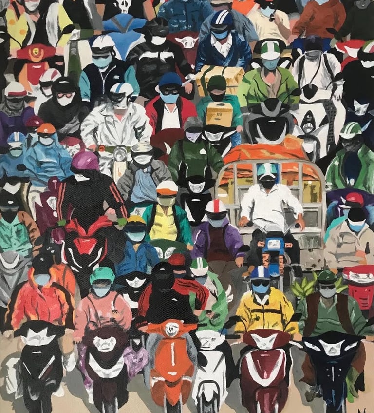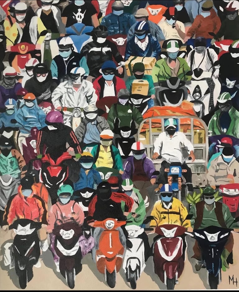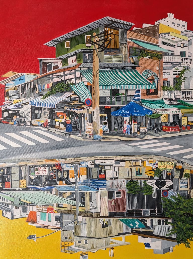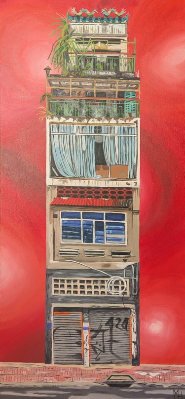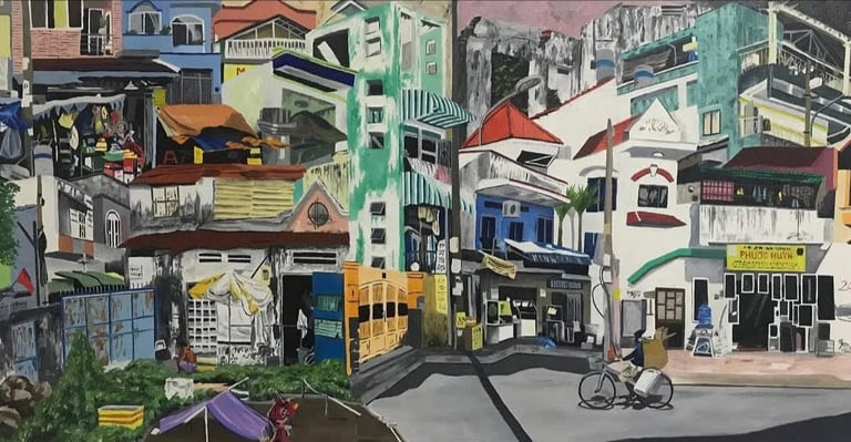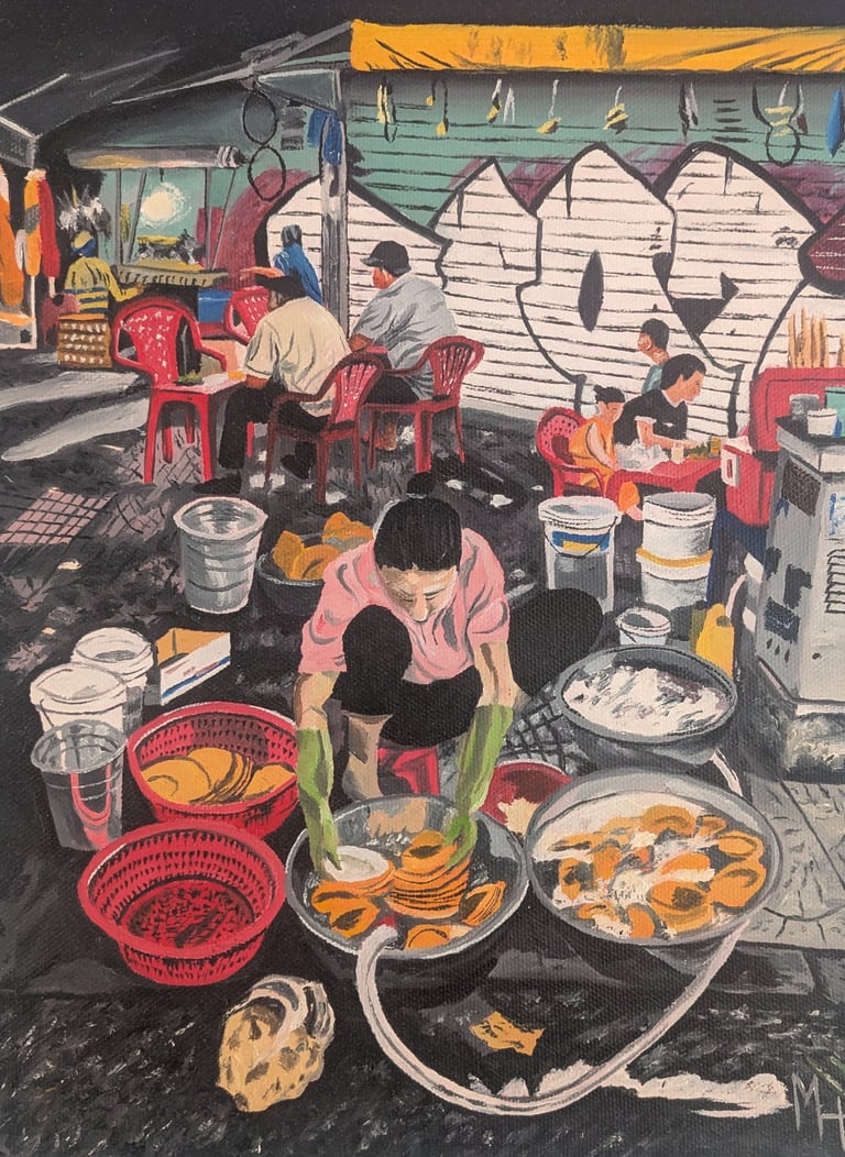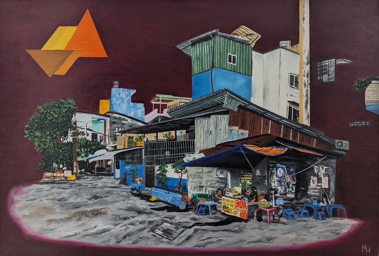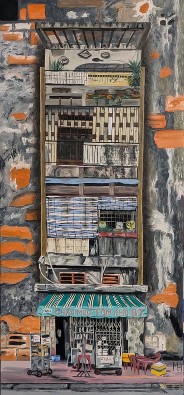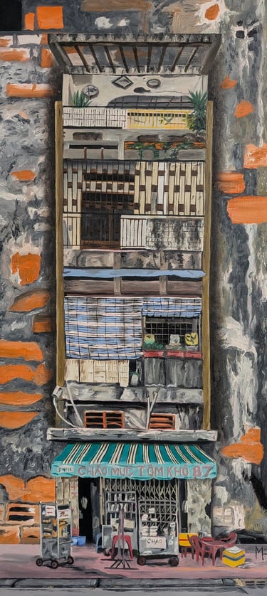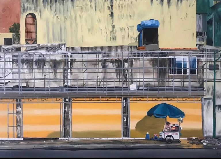 Michael's artwork captures the essence of everyday life in Vietnam beautifully; with his choice of rugged, sometimes temporary locations.