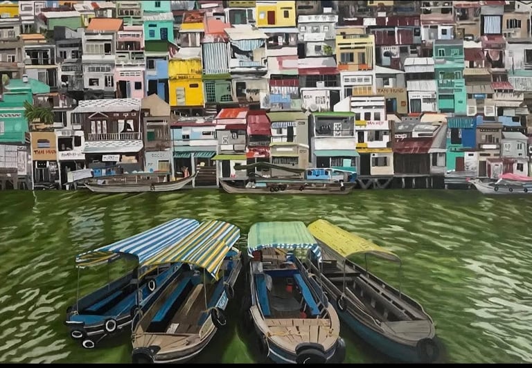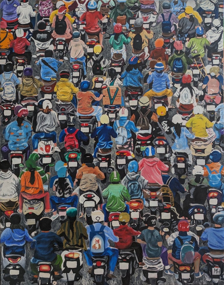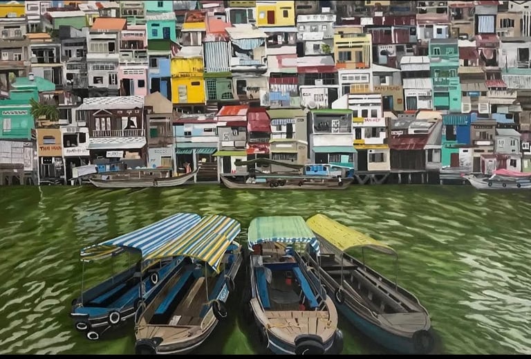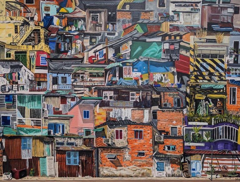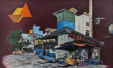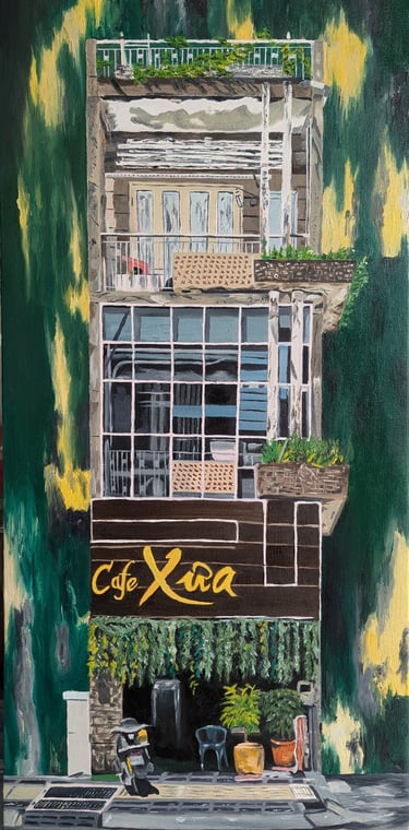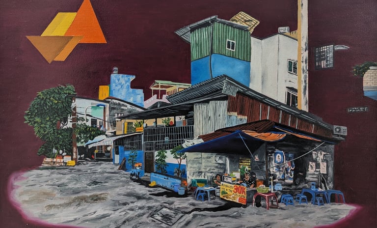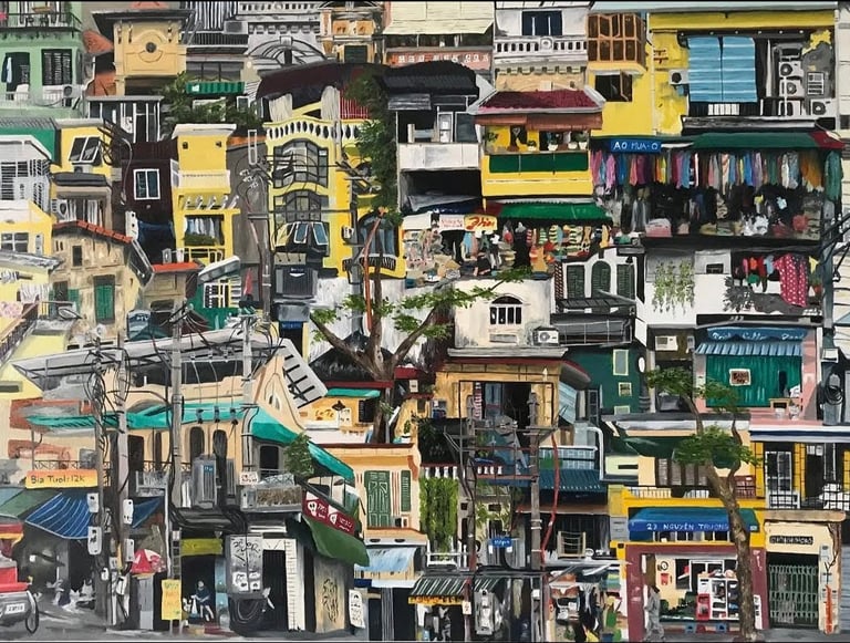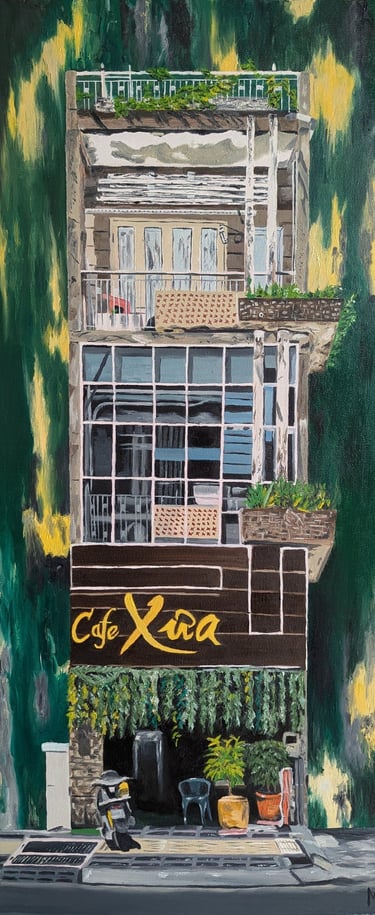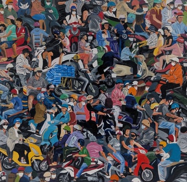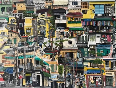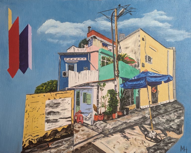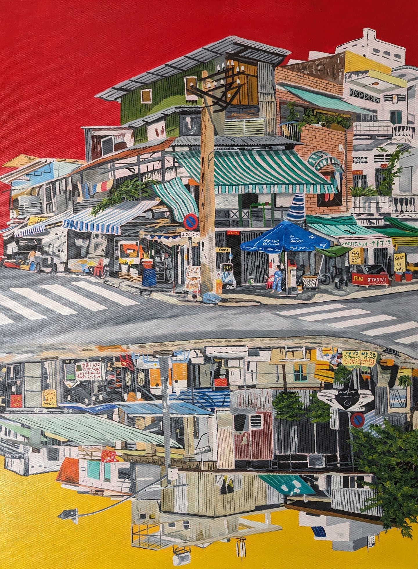 Michael's artwork captures the essence of everyday life in Vietnam beautifully; with his choice of rugged, sometimes temporary locations.