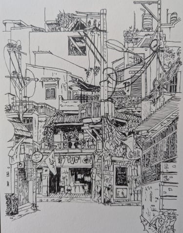 Ink and pencil crayon drawings of urban areas as well as the stacking of houses in Saigon